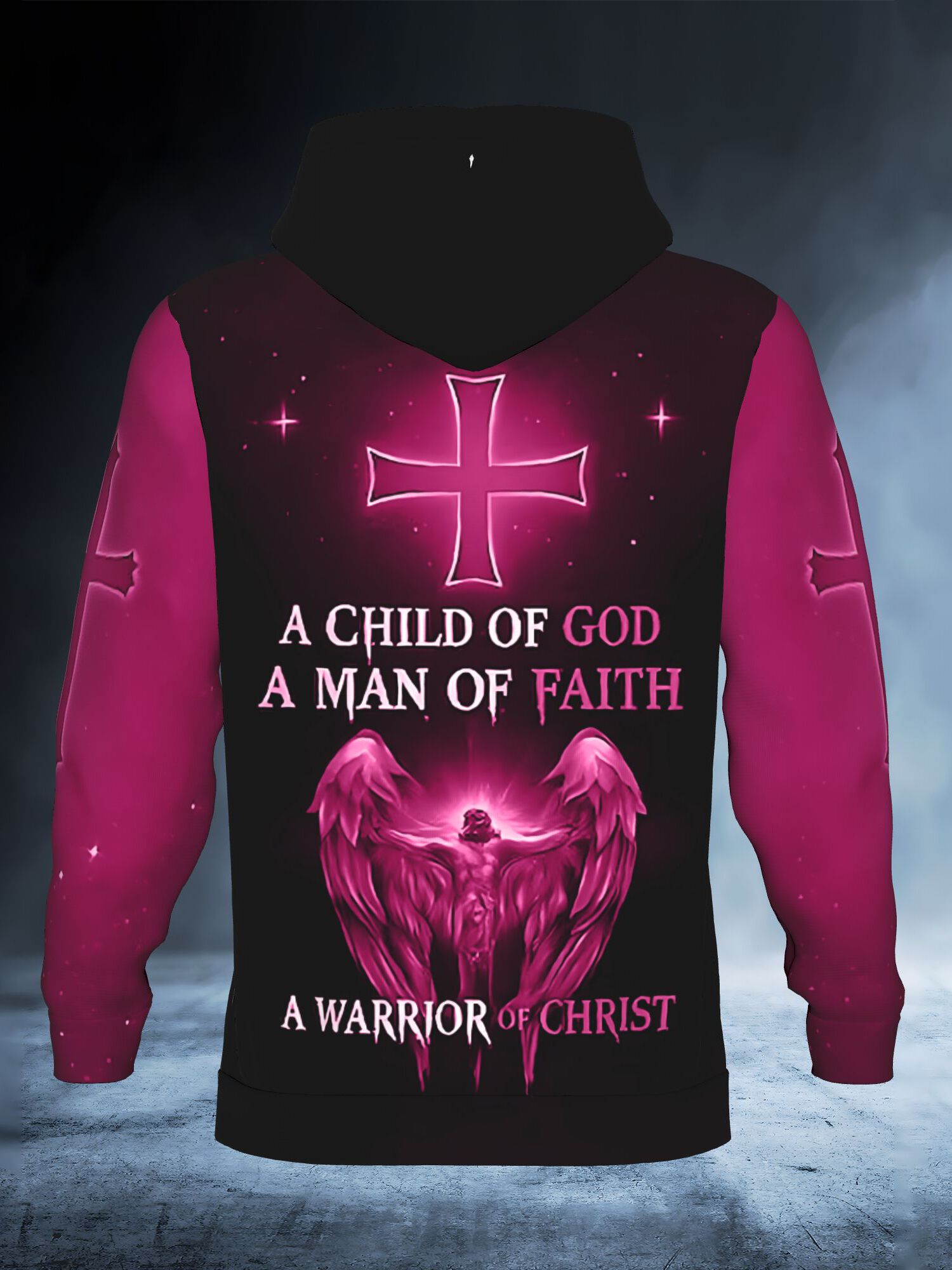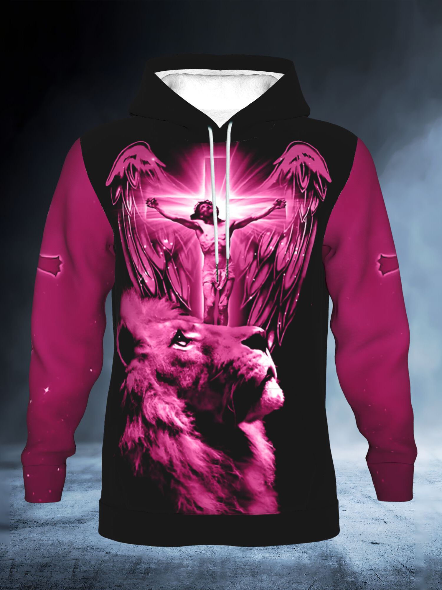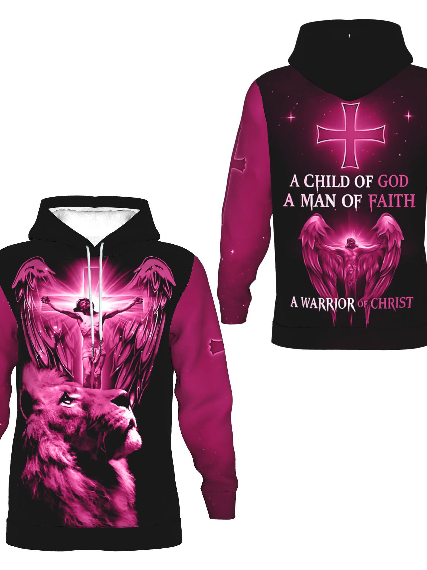 Men's Christian 3D Full-Body Print Hoodie - Pink Lion & Angel Wings with Cross Back Design, A Child of God Warrior of Christ, All-Day Comfort Round Neck Pullover, Machine Washable Winter Warmth for Church, Casual & Outdoor Faith Apparel