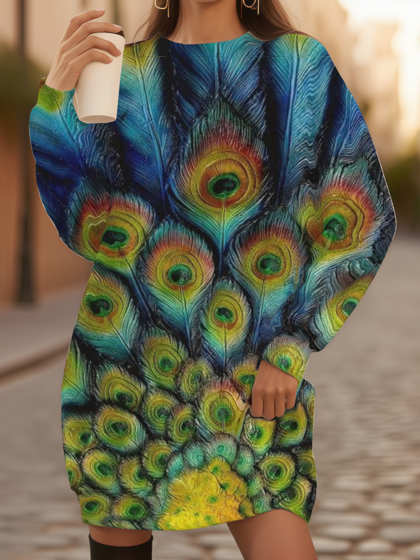 Plus Size Women's 3D Printed Peacock Sweater - Turquoise Turquoise Blue Green Turquoise Yellow Pink Multicolor Oversized H-Line Silhouette, Winter Warm Long Sleeve Crew Neck Casual Pullover, Machine Washable All-Season Blouse (No