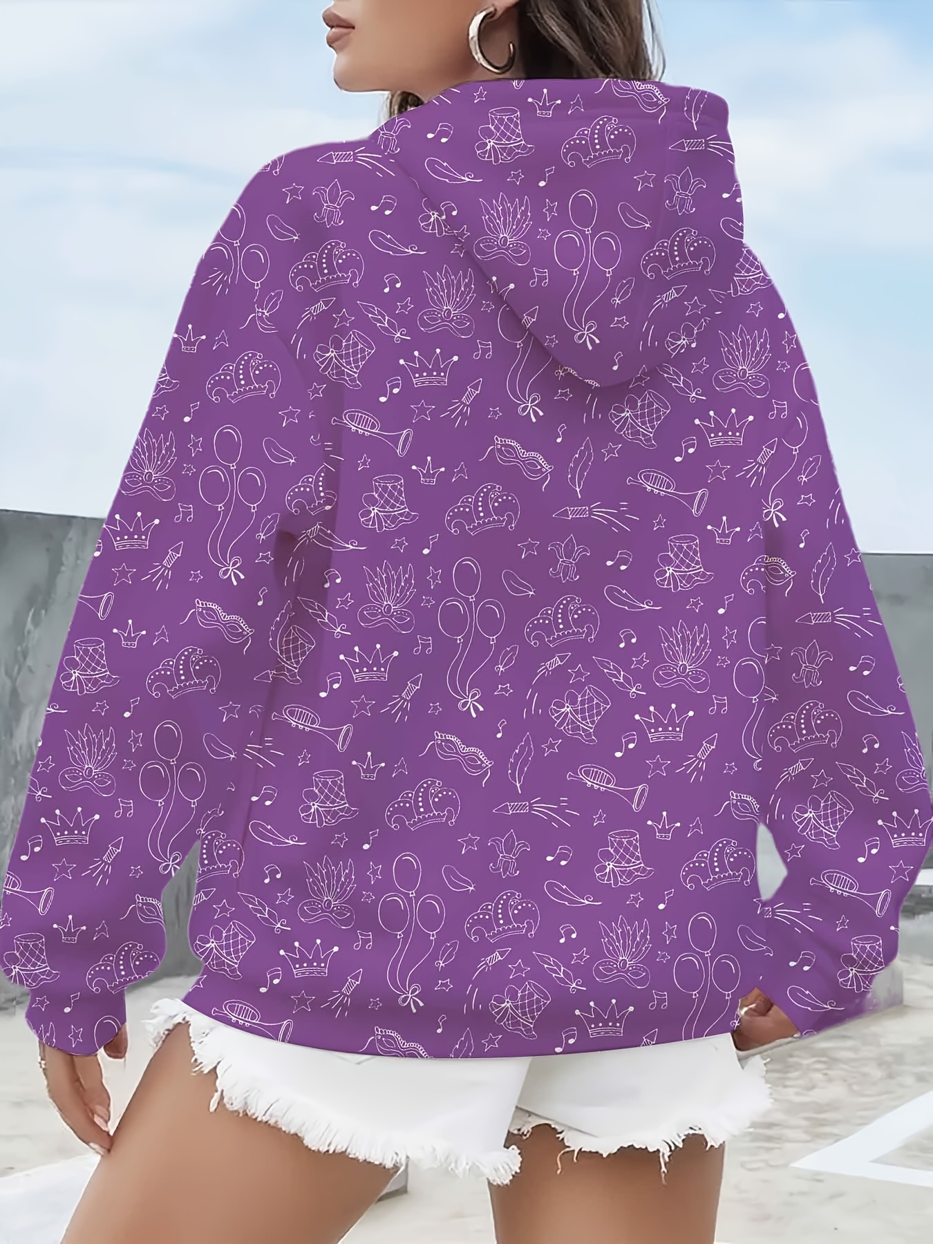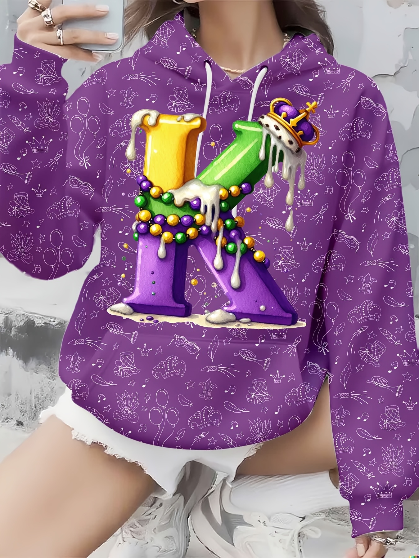 Plus Size Women'S Mardi Gras Mask and Crown Letter K Full Printed Hoodie | Cute Style with Pocket, Hooded, Pullover, Slight Stretch Fabric, Regular Sleeve and Length for Party and Casual Wear