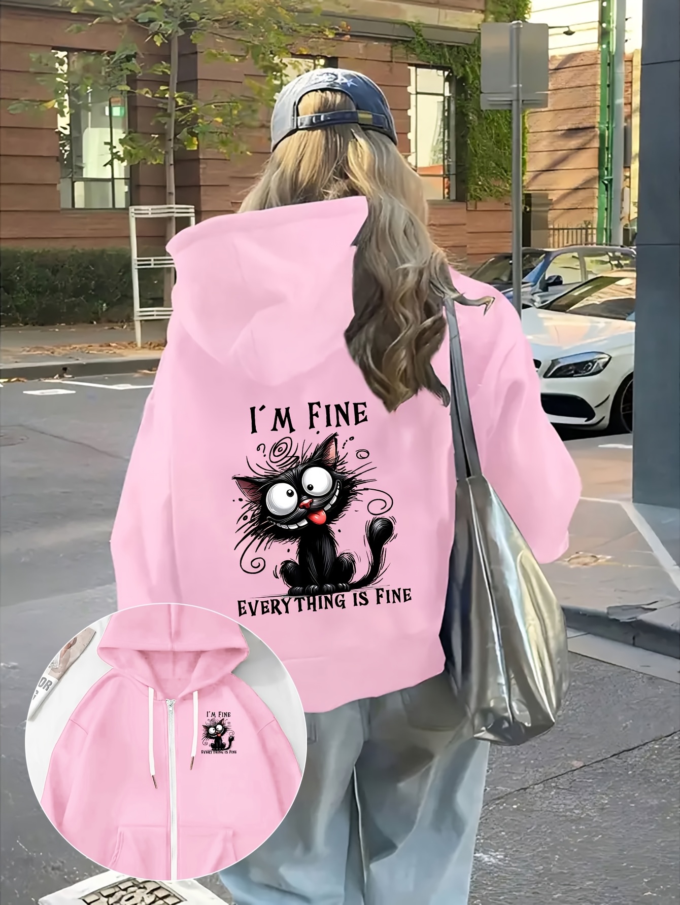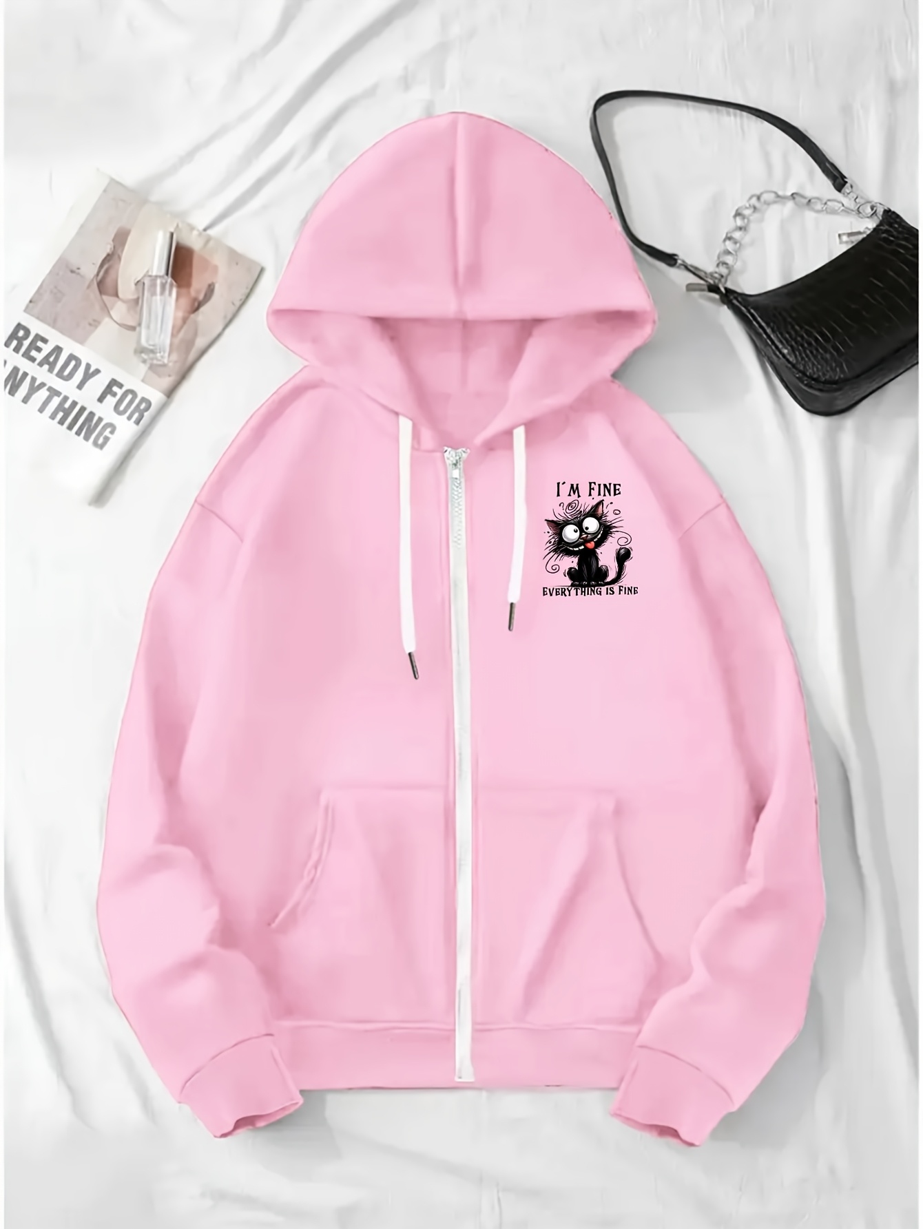 Women's 'I'm Fine, Everything's Fine' Letter and Cat Print Hooded Zipper Jacket- Long Sleeve Casual Sportswear with Pockets, Machine Washable, Bright Pink for Autumn and Winter