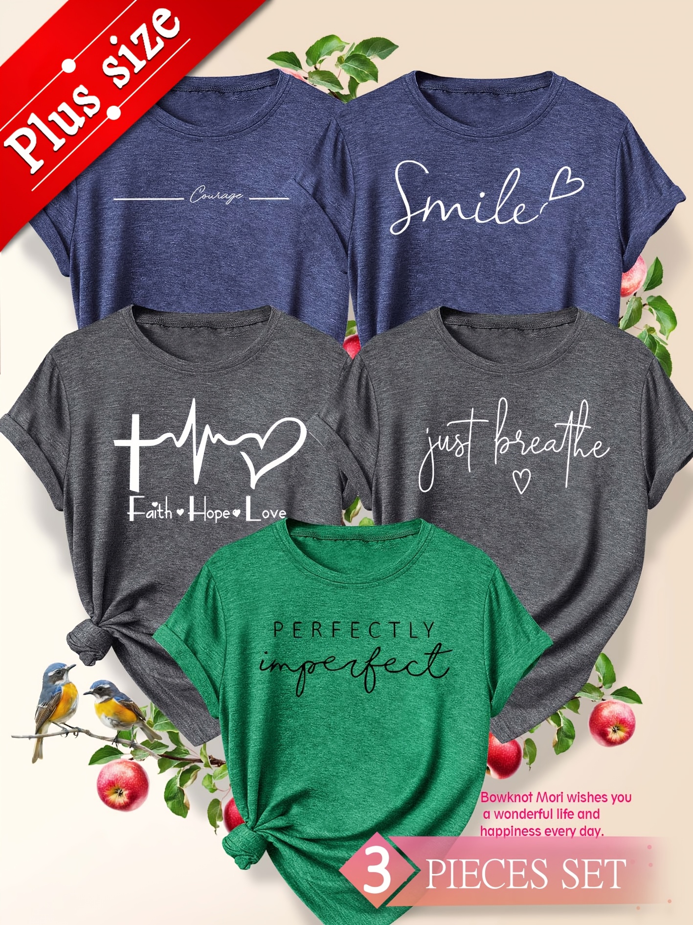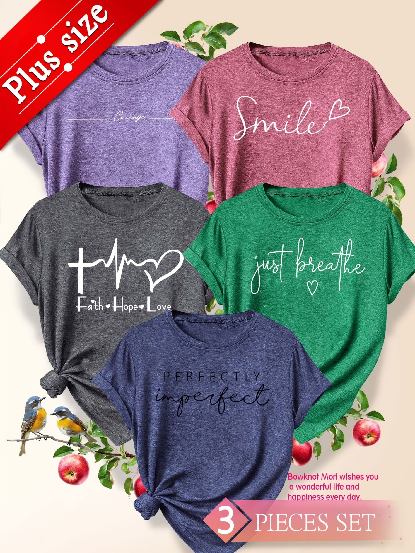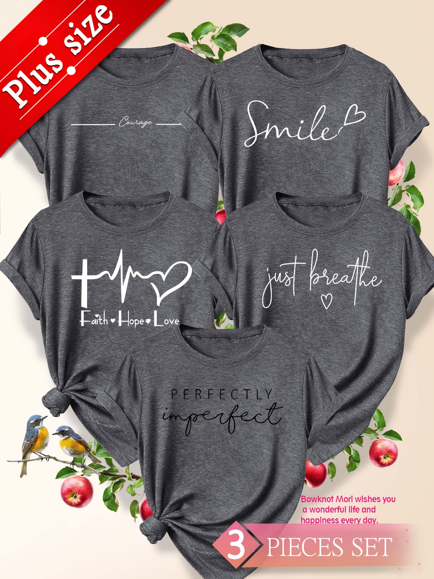 5pcs Plus Size Women'S Tops | Courage Heartbeat Just Breathe Pattern Print, Literary Style, Casual Versatile Round Neck, Comfortable Breathable, Oversized Loose Fit, 1XL-5XL Size