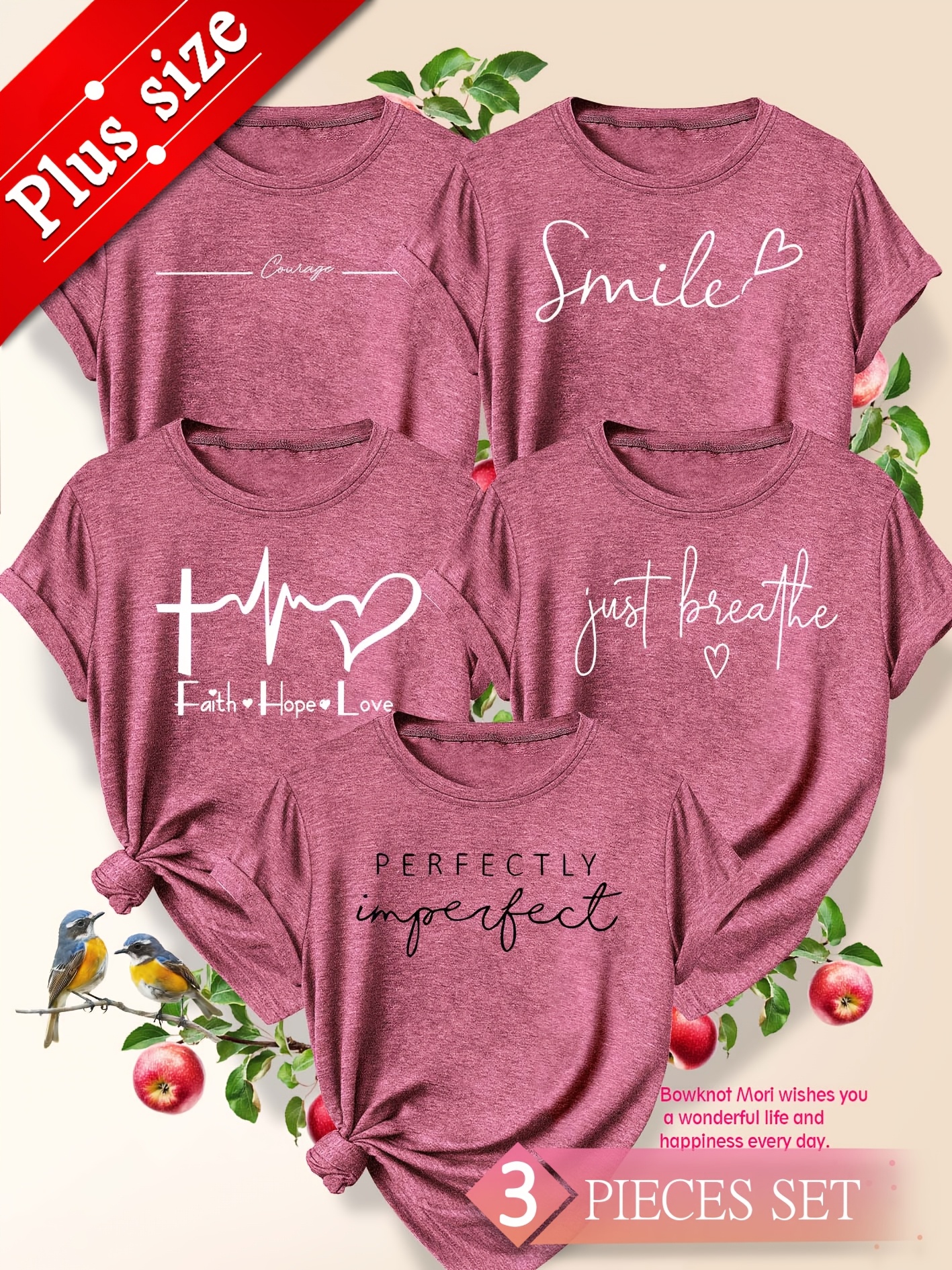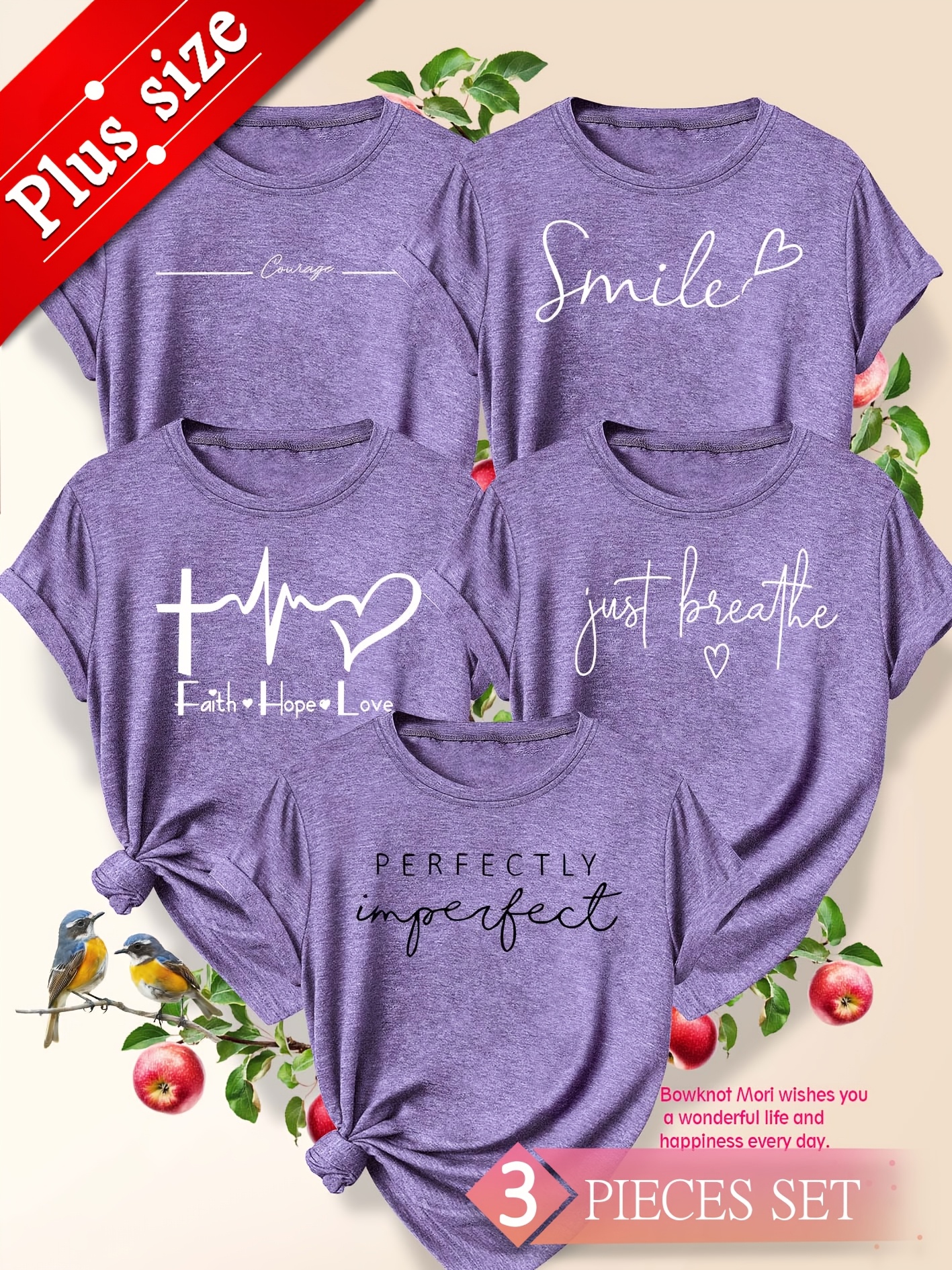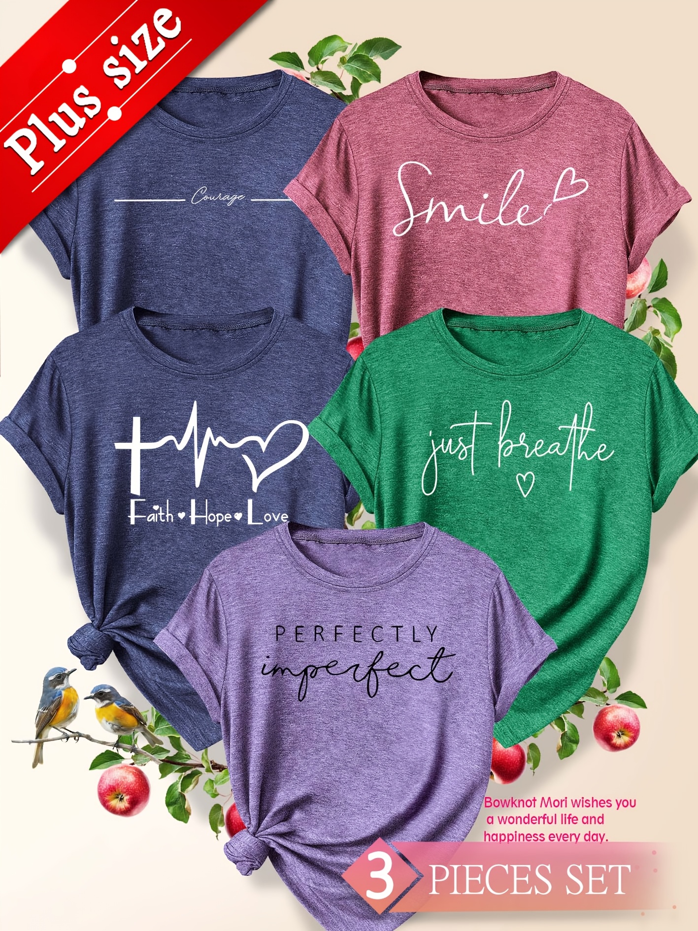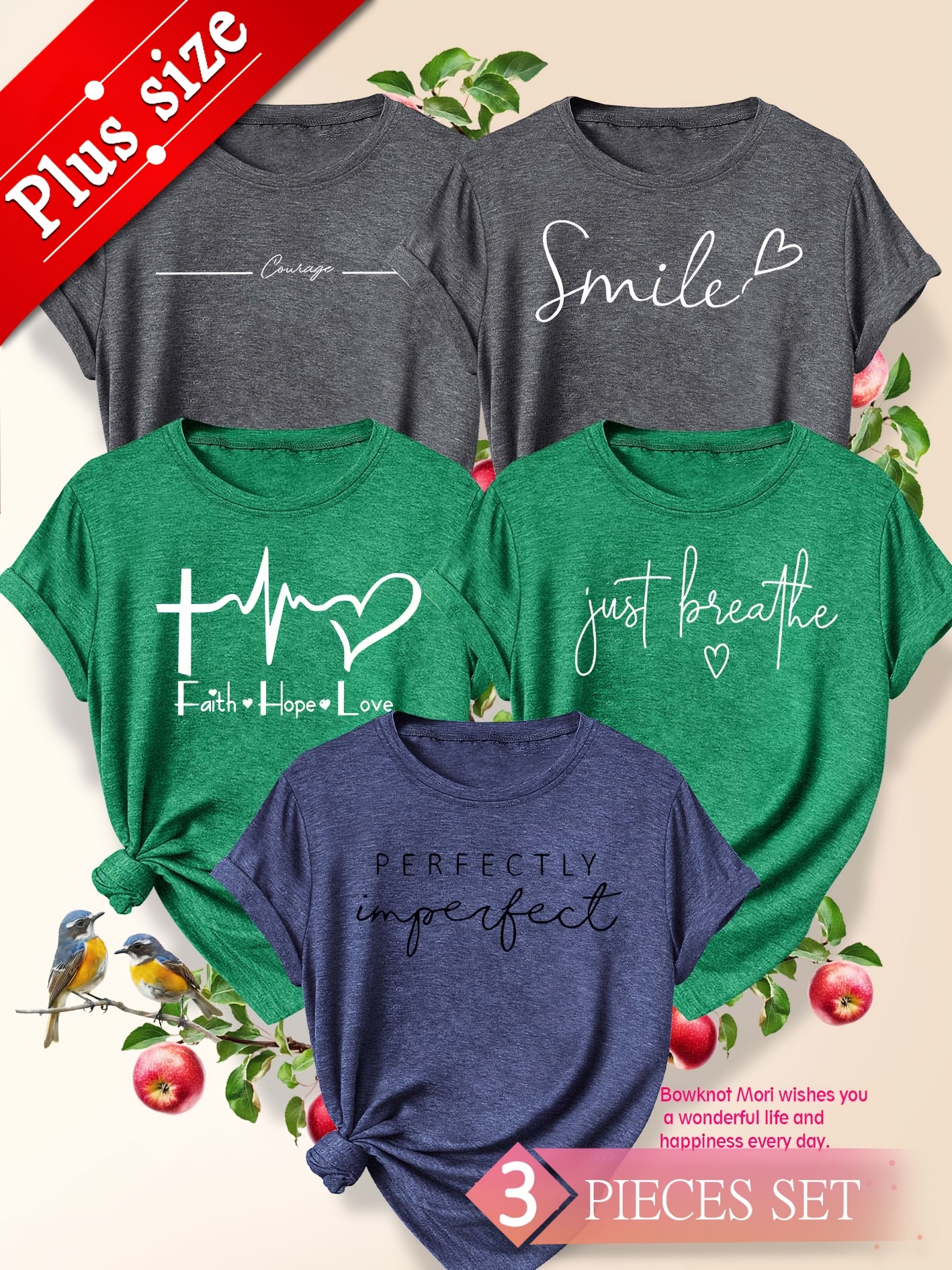 5pcs Plus Size Women'S Tops | Courage Heartbeat Just Breathe Pattern Print, Literary Style, Casual Versatile Round Neck, Comfortable Breathable, Oversized Loose Fit, 1XL-5XL Size