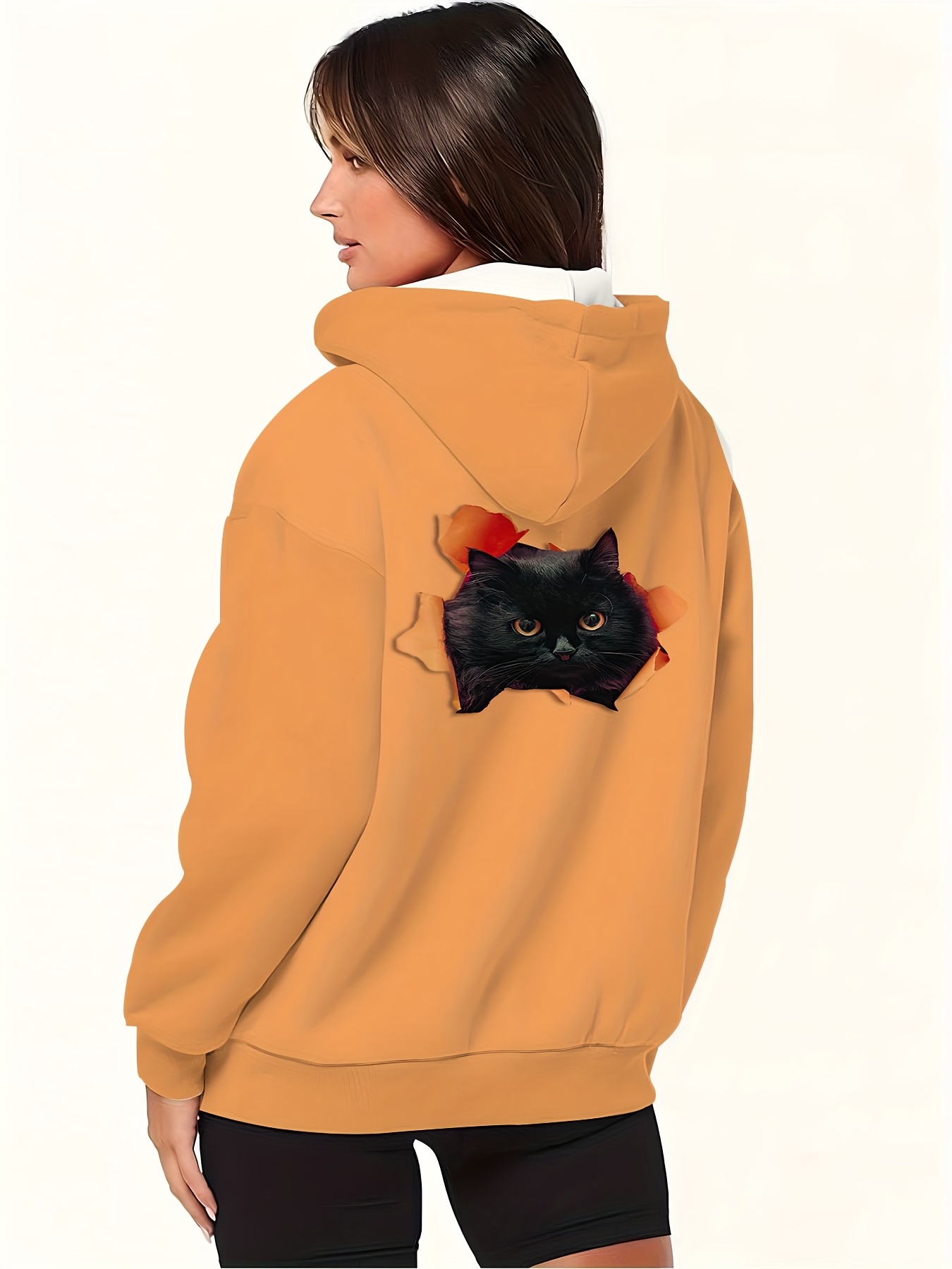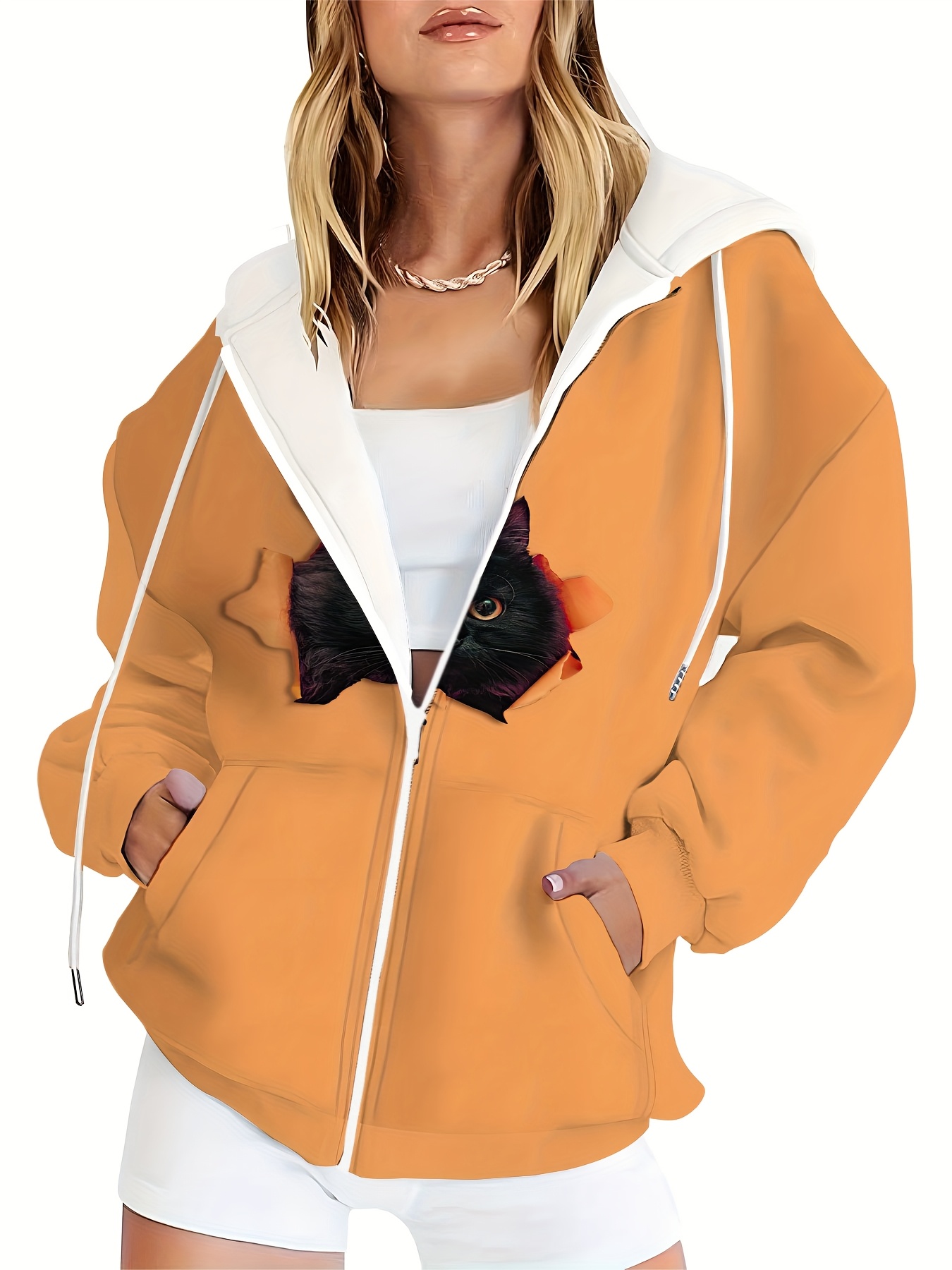 Women's Plus Size Oversized Hooded Zip-Up Jacket with 3D Black Cat Print - Soft Stretchy Full-Zip Coat, Brown with Black Cat Design, Cozy Hood & Front Zipper Closure, Machine Washable Casual Outerwear for Cat Lovers (Spring/Fall/Winter)