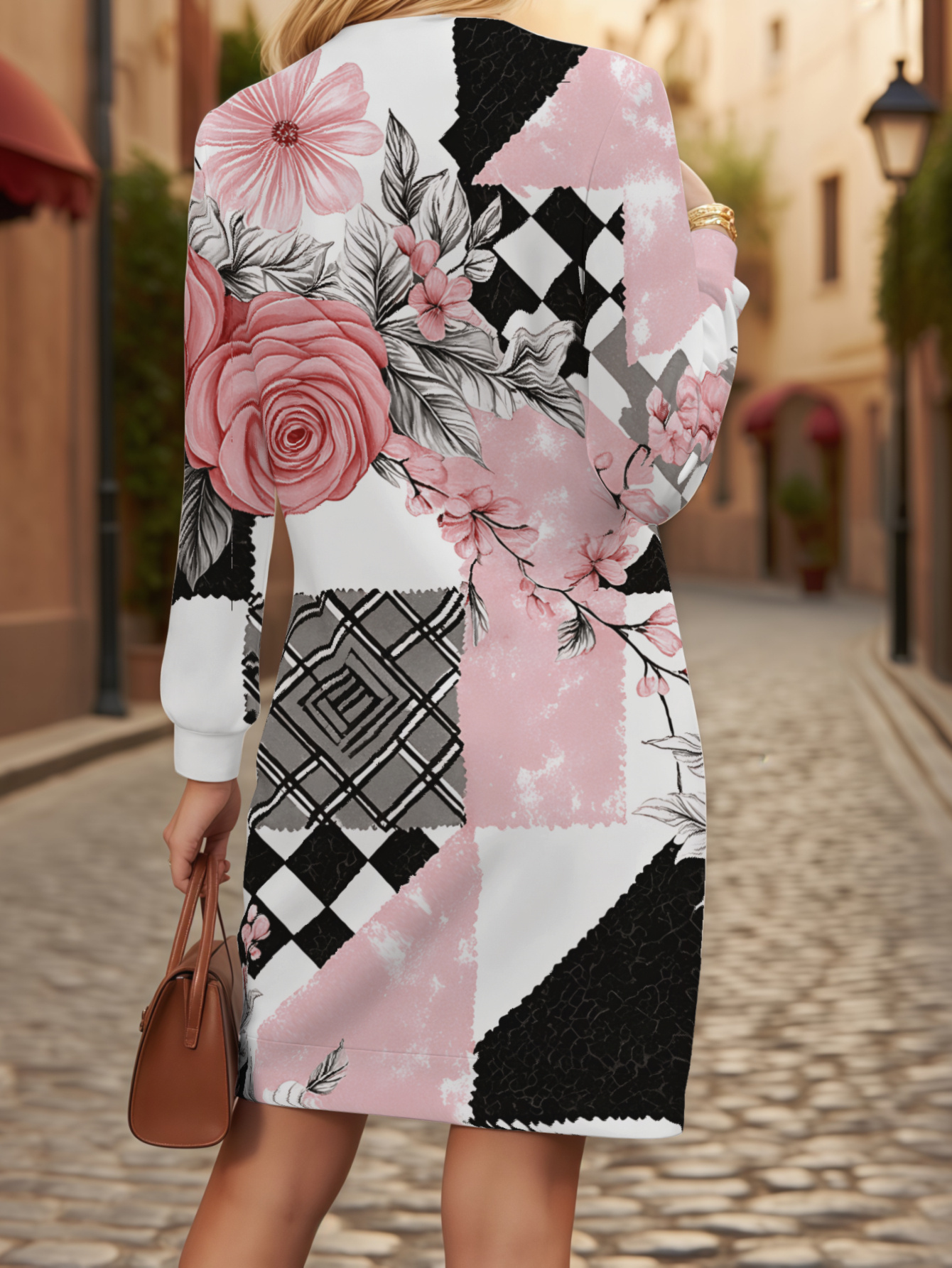 Women'S Plus Size Black & Pink Floral Print Sweater Dress - All-Season Machine Washable Long Sleeve Sweater with A-Line Silhouette, Soft Comfortable Pullover for Everyday & Formal Outfits, Casual to Semi-Formal Wear, Cozy Fall Winter Sweater Dress (