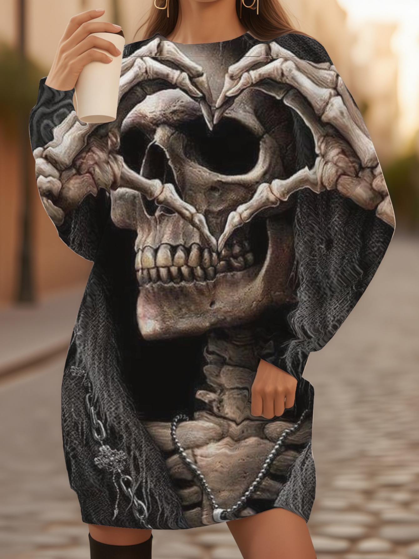 Women's Plus Size Gothic 3D Skull & Bat Wing Full-Body print Sweater Dress - Loose Fit Batwing Dress with 3D Skull Print, Machine Washable Long Sleeve Crewneck for Halloween Costumes, Themed Parties & Daily Wear (Polyester) - Gothic Attire for
